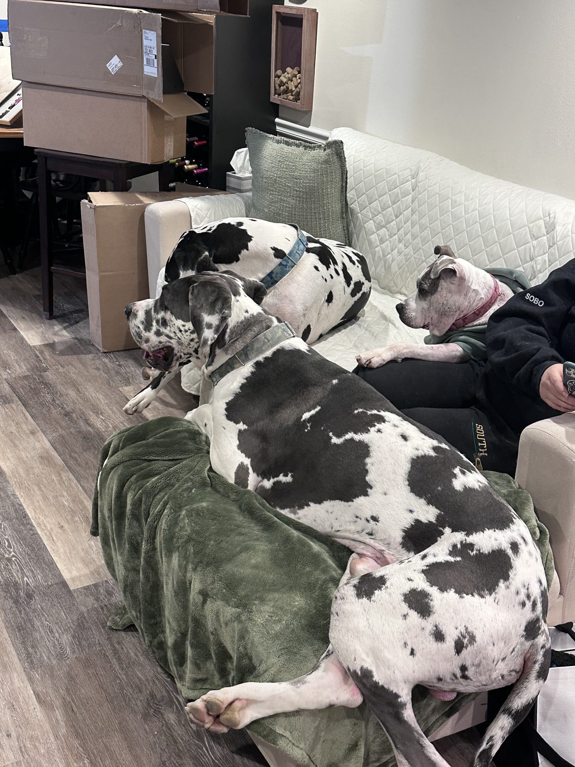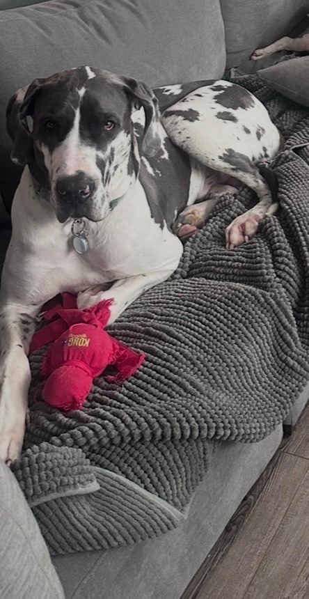 This handsome guy is housebroken, crate trained, sleeps through the night, and settles nicely into a routine—pretty impressive for a young Dane still learning the world. He thrives with structure and responds well when his needs are clearly met.
