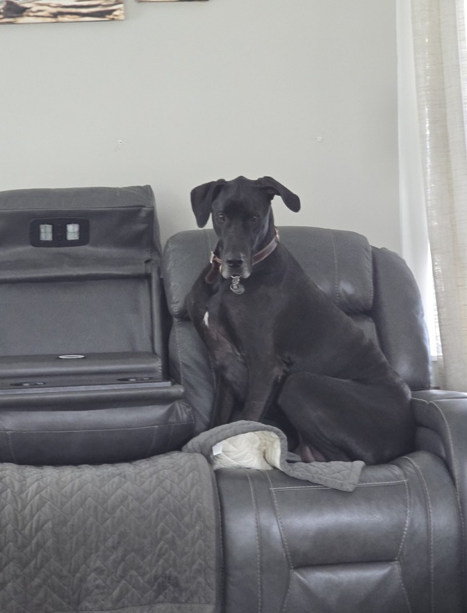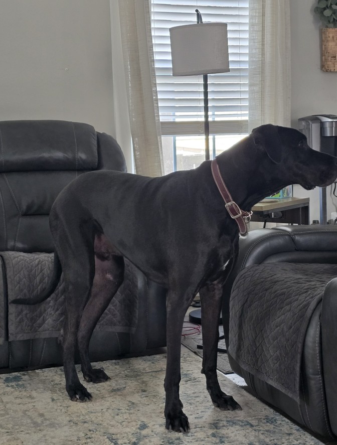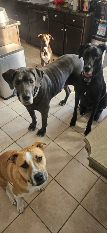 This sweet boy gets along well with other dogs, cats, and even chickens—his easygoing temperament makes him a great fit for many different households. He’s polite, well‑mannered, and eager to please. Like most tall Danes, he occasionally explores those tempting countertops, but he listens immediately when corrected and continues to prove how smart and responsive he is.