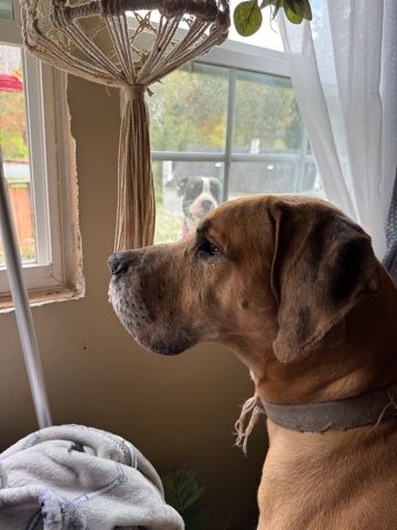 Duke is a 2½-year-old Great Dane mix in need of a new home. His current owner has been working since early 2024 to rehome him after conflicts developed between him and two resident Great Danes. Due to escalating fights, Duke now lives separately and requires a home without large dogs. He has done well with cats and with medium-sized dogs.