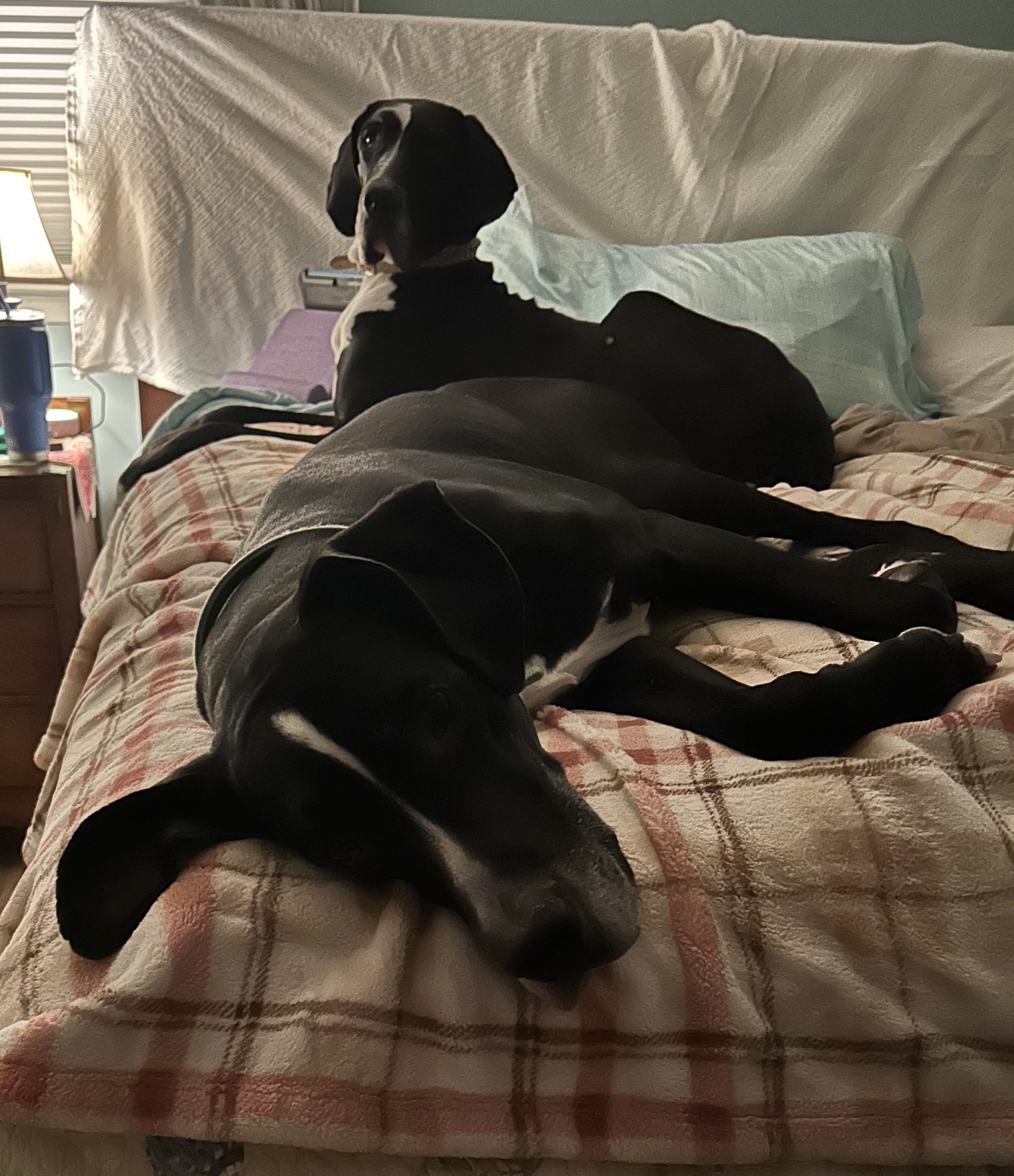 Lulu pink collar (3-year-old spayed female, DOB 11/26/2022) and Duke green collar (4-year-old male, DOB 9/4/2021)are a bonded Great Dane pair who recently lost both their owner and their home. After so many changes in a short time, they are looking for a stable, loving family who can offer them security, structure, and plenty of attention.