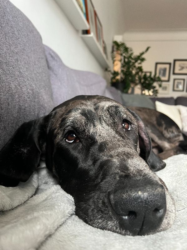 If you’re looking for a sweet, snuggly, slightly-smaller Dane with a tender soul and a big heart, Mia might just be your perfect match.
