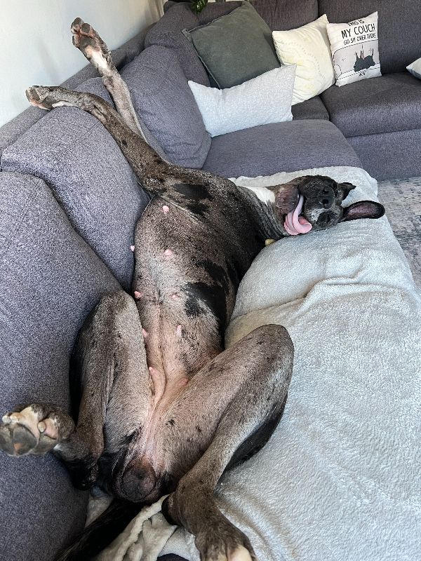 Mia is a 1.5-year-old Merle Great Dane girl with a gentle spirit and a heart of pure gold. At about 120 lbs, she’s on the smaller side for a Dane — and every ounce of her is pure sweetness. She’s beautifully soft-natured, endlessly kind, and happiest when she’s leaning in for a cuddle. This gorgeous girl bonds deeply and loves being close to her people — she’ll even sleep soundly through the night curled up next to you.