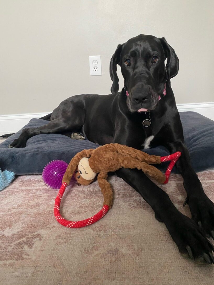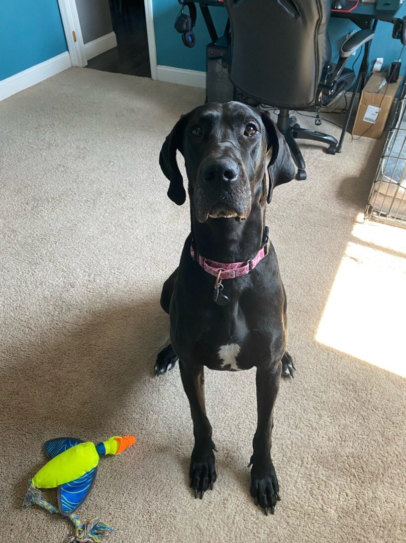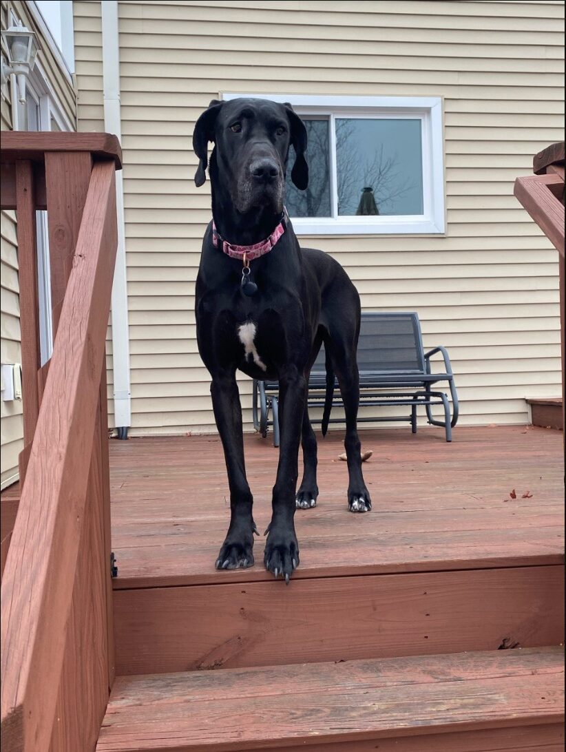 09/22/2025 Phoebe is a 2 year old black female with natural ears. She is a Great Dane but she is pretty sure she’s a tiny, graceful gazelle.